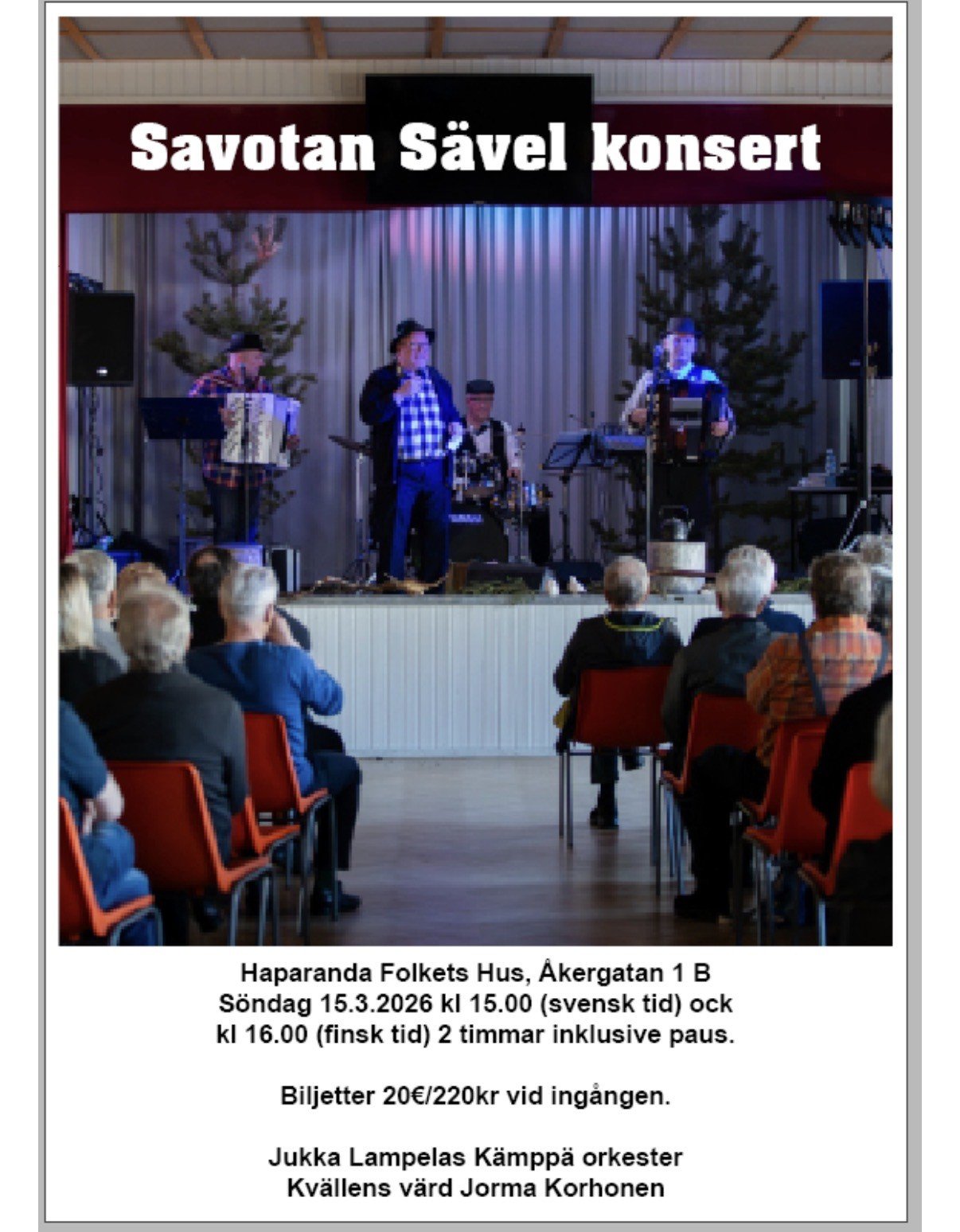 SAVOTAN SÄVEL -konsertti: Kesto noin 2 tuntia, lyhyt väliaika. Kämppäorkesteri: Jukka Lampela, harmonikka ja laulu – Markku Laamanen, rummut ja taustalaulu – Mikko Keskimaunu haitari ja laulu – Jorma Korhonen, konsertin juonto.