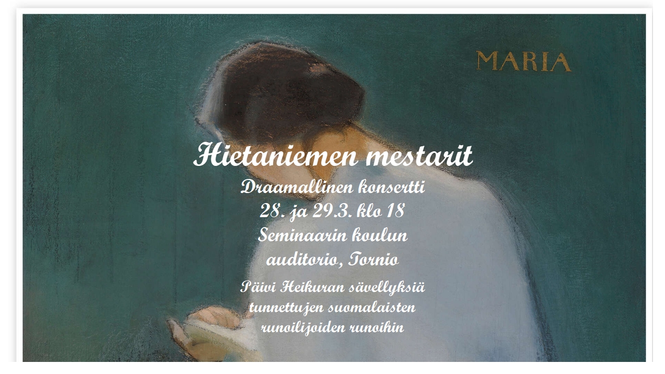 Hietaniemen mestarit on draamallinen konsertti, jossa kuullaan Päivi Heikuran sävellyksiä tunnettujen suomalaisten runoilijoiden runoihin. Muusikoina ovat Päivi Heikura, Maria Hägg, Jani-Petteri Hägg, Adam Huuva, Elina Haapaniemi, Marko Haapaniemi, Juhani Hägg, Mirja Tapio, Jenni Witick ja Matias Torvinen.